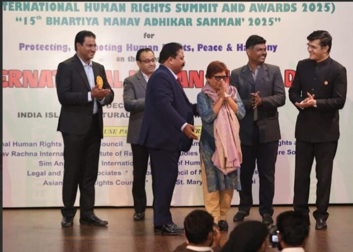 विश्व मानवाधिकार दिवस पर नई दिल्ली में आयोजित 15वें भारतीय मानव अधिकार सम्मान 2025 में 40 वर्षों से पीड़ित महिलाओं के लिए कार्य करने पर सम्मान।