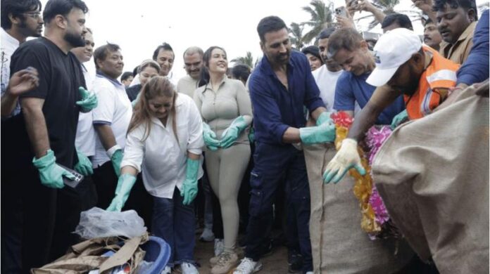 महाराष्ट्र। महाराष्ट्र के मुख्यमंत्री देवेंद्र फडणवीस की पत्नी अमृता फडणवीस ने रविवार को गणपति विसर्जन के बाद जुहू बीच पर एक सफाई अभियान चलाया। अमृता फडणवीस ने बृहन्मुंबई नगर निगम (बीएमसी) के सहयोग से अपने फाउंडेशन, दिव्यज फाउंडेशन की ओर से इस सफाई अभियान का आयोजन किया। इसमें बॉलीवुड अभिनेता अक्षय कुमार भी शामिल हुए। वीडियो में, अक्षय कुमार जुहू बीच की सफाई करते हुए एक बैग में बड़ी-बड़ी फूलों की मालाएं और बोतलें, गंदे कपड़े वगैरह डालकर सफाई करते नजर आए।