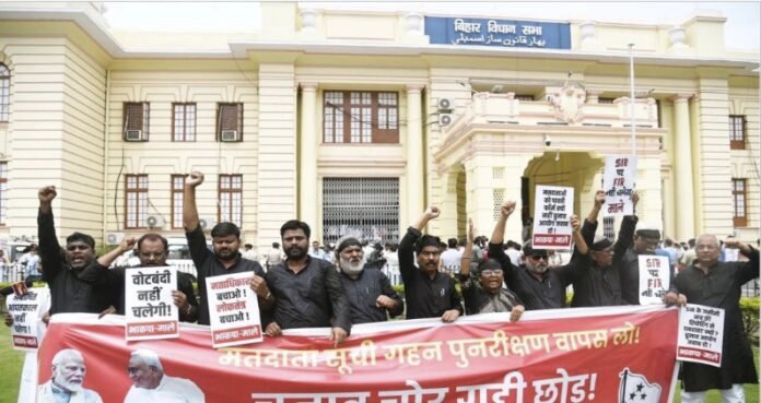 बिहार में स्पेशल इंसेंटिव रिवीजन को लेकर विपक्ष लगातार विरोध प्रदर्शन कर रहा है. आज इसको लेकर विधानसभा में जमकर हंगामा हुआ. विधानसभा की कार्यवाही शुरू होते ही विपक्ष ने हंगामा शुरू कर दिया. दूसरी पाली की कार्यवाही जैसे ही शुरू हुई, एसआईआर के खिलाफ विपक्षी विधायक वेल में पहुंच गए और जमकर नारेबाजी करने लगे. इसी बीच स्पीकर के सामने की कुर्सी भी उठा ली गई.