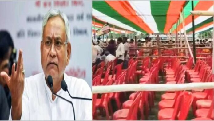 स्थिति यह थी कि आम लोगों से ज्यादा पुलिस बल सभास्थल पर दिखाई दे रहे थे. वहीं भीड़ नहीं जुटने के कारण कुर्सियों को समेट कर एक जगह कर दिया गया था. और जितनी कुर्सियां सभास्थल पर लगाई गई, उसमें भी ज्यादातर खाली दिखाई दे रही थी. शायद खाली कुर्सियों का ही असर था कि इतने सारे अतिथि मंच पर दिखाई दिए लेकिन इसमें सिर्फ मुख्यमंत्री नीतीश कुमार चंद मिनट का भाषण दिए और सभा खत्म भी हो गई.
