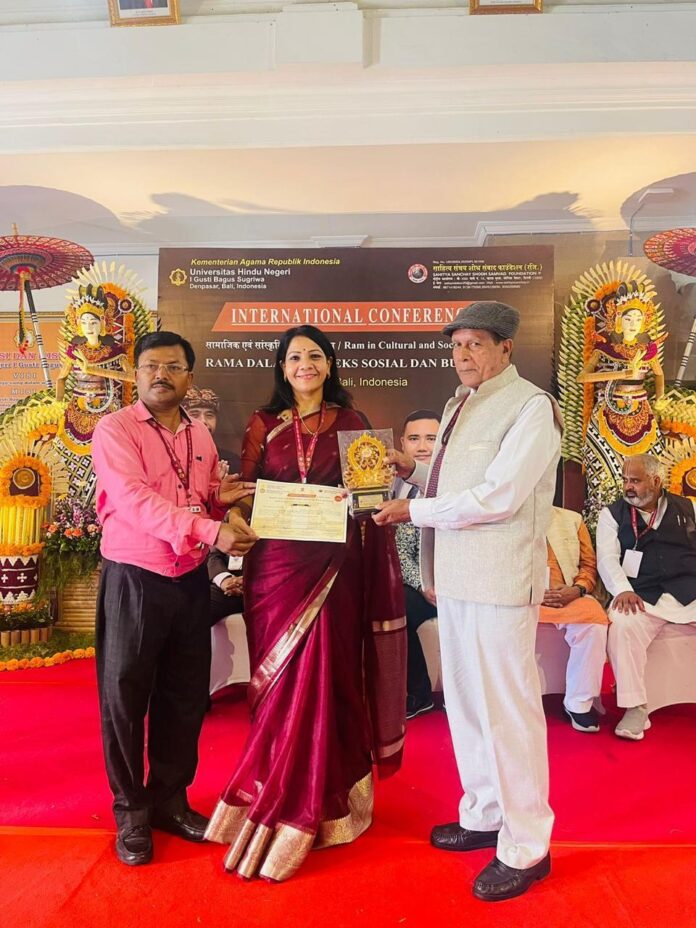 अलवर. BSR महाविद्यालय अलवर में संस्कृत विभाग की वरिष्ठ प्रोफेसर एवं राष्ट्रीय आदिवासी एकता मंच की प्रदेशाध्यक्ष तथा जिला समन्वयक राष्ट्रीय सेवा योजना अलवर डॉ सरोज मीना ने बाली इंडोनेशिया में पत्र वाचन किया। उन्होंने आई गुस्ती बागस सुग्रीव स्टेट हिंदू यूनिवर्सिटी देनपसार बाली—इंडोनेशिया एवं साहित्य संचय शोध संवाद संस्थान दिल्ली के संयुक्त तत्वावधान में आयोजित दो दिवसीय अंतरराष्ट्रीय सेमिनार में “प्रतीक चिन्हों में परिलक्षित भारतीय संस्कृति ” विषय पर अपना शोधपत्र वाचन किया। डॉ. मीना ने देनपसार शहर में इंटरनेशनल डिवाइन लवर्स सोसाइटी परमधाम आश्रम -देनपसार इंडोनेशिया की ओर से आयोजित काव्य संध्या में काव्य पाठ किया। संगोष्ठी का आयोजन दिनांक 14 व 15 जून 2024 को हुआ था। पत्र वाचन के लिये डॉ. सरोज मीना को प्रमाण पत्र व पुरस्कार देकर सम्मानित किया तथा काव्य संध्या में उत्तम काव्य पाठ करने पर “परमधाम आश्रम “देनपसार इंडोनेशिया के द्वारा प्रोफेसर डॉक्टर सरोज मीणा को “गलूगन कल्चरल अवार्ड ” से सम्मानित भी किया गया । इस दस दिवसीय अकादमिक व शैक्षणिक भ्रमण कार्यक्रम में डॉक्टर सरोज मीणा द्वारा 13 जून से 21 जून तक बाली के विभिन्न नगरो यथा बाली,कुटा , देनपसार , कुबु, बेनोआ, तुबान का भ्रमण कर वहां की साहित्यिक, सांस्कृतिक धार्मिक पृष्ठभूमि की गंवेषणा की गई तथा कुटा प्रदेश के उलुवात में स्थित विश्व प्रसिद्ध हिंदू समुंदरी मंदिर “उलुवातु ” में विशुद्ध हिन्दु परम्परा पर आधारित “केचक डान्स ” जो कि श्रीराम के चरित्रांकन पर आधारित है को देखा तथा तम्बपक श्रृंगी में “तिरथा इम्पुल “भारतीय संस्कृति पर आधारित मन्दिर के दर्शन किए। शैक्षणिक भ्रमण के अंतर्गत वियतनाम देश का भी तीन दिवसीय भ्रमण किया गया और वहा बाऊ तेंग चुंग के “वार रिमेन्ट म्यूजियम व हो ची मिन्ह सिटी में “प्रेसीडेन्ट स्टेच्यू व माई थो में स्थित “तंग रिवर और त्रा मत ओंग डेल्टा का अवलोकन किया।