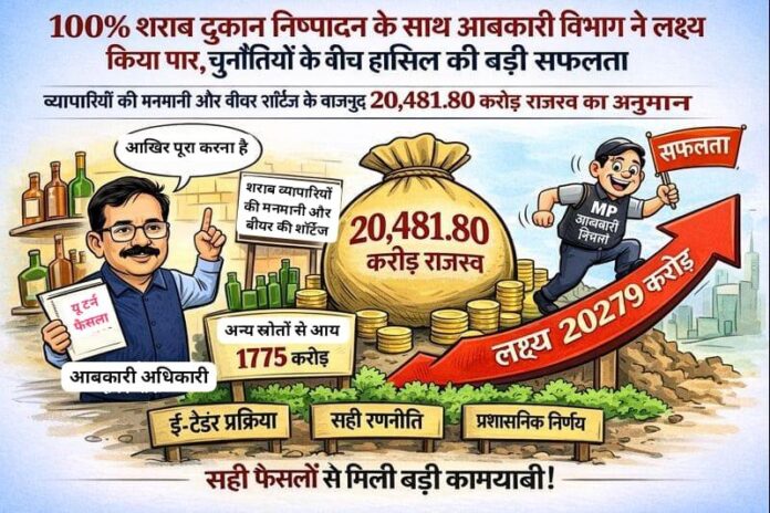 भोपाल।  मध्यप्रदेश में वित्तीय वर्ष 2026-27 के लिए आबकारी विभाग ने सभी 3553 शराब दुकानों का सफलतापूर्वक निष्पादन कर एक बड़ी उपलब्धि दर्ज की है। विभाग को इन दुकानों से कुल 18,676.80 करोड़ रुपये का राजस्व प्राप्त हुआ है, जो पिछले वर्ष के वार्षिक मूल्य की तुलना में 12.33 प्रतिशत अधिक है। हालांकि इस पूरे वित्तीय वर्ष के दौरान शराब व्यापारियों की मनमानी और बीयर की शॉर्टेज जैसी समस्याएं भी सामने आईं। इन चुनौतियों के बीच आबकारी विभाग के कमिश्नर दीपक सक्सेना ने रेवेन्यू को अधिकतम स्तर तक पहुंचाने के लिए कई अहम फैसले लिए और जरूरत पड़ने पर यू-टर्न भी लिए। अंततः विभाग सरकार द्वारा निर्धारित लक्ष्य को हासिल करने में सफल रहा। दुकानों के अलावा अन्य स्रोतों से भी लगभग 1,775 करोड़ रुपये की आय होने का अनुमान है, जो दुकानों से प्राप्त राजस्व का करीब 9.5 प्रतिशत है। इस प्रकार कुल राजस्व संग्रह 20,481.80 करोड़ रुपये तक पहुंचने का अनुमान है।