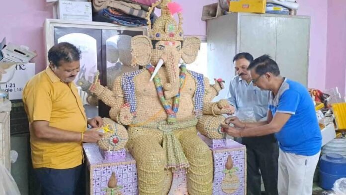 सागर/बीना: 27 अगस्त से गणेशोत्सव का पर्व शुरू होने जा रहा है. ऐसे ही सागर जिले के बीना के एक स्थानीय मूर्ति कलाकार अशोक साहू पिछले 38 सालों से पर्यावरण को ध्यान में रखकर केवल एक ही इको फ्रेंडली गणेश प्रतिमा बना रहे हैं. इस बार भी उन्होंने करीब सोयाबीन की 51 हजार बड़ी से 21 किलो वजन की 7 फीट ऊंची गणेश प्रतिमा को तैयार किया है.