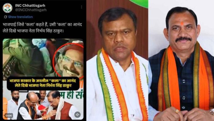 छत्तीसगढ़ कांग्रेस ने सोशल मीडिया प्लेटफॉर्म X पर एक वीडियो साझा करते हुए दावा किया कि अश्लील डांस के दौरान BJP नेता निर्भय सिंह ठाकुर भी वहां मौजूद थे। कांग्रेस ने पोस्ट में तंज कसते हुए लिखा कि भाजपा जिसे ‘कला’ कहती है, उसी ‘कला’ का आनंद लेते हुए उसके नेता नजर आए। इस दावे के सामने आते ही प्रदेश की राजनीति में बयानबाजी का दौर शुरू हो गया।
