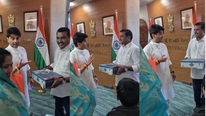 दरअसल, ग्वालियर जिला पंचायत सदस्य अनूप कुशवाह अपनी बेटी की शादी का निमंत्रण लेकर केंद्रीय मंत्री ज्योतिरादित्य सिंधिया के पास दिल्ली पहुंचे। अनूप कुशवाह ने अपनी बेटी की शादी का कार्ड केंद्रीय मंत्री को दिया, तो उन्होंने पूछा कि किसकी शादी है? अनूप कुशवाह ने कहा- बेटी की शादी है फिर उन्होंने पूछा कितनी बेटियां है। इस पर जिला पंचायत सदस्य की पत्नी ने कहा – तीन बेटियां हैं, अनूप कुशवाह ने कहा कि दो बेटियों की शादी हो चुकी है। आखिरी बेटी की शादी है ज्योतिरादित्य सिंधिया ने अनूप कुशवाह से कहा कि अब तुम तो मुझे शर्मिंदा कर रहे हो, युवराज साहब 30 साल के हो गए। अब तो उनकी जल्दी शादी पक्की करानी पड़ेगी. दोनों के बीच ये हल्का-फुल्का अंदाज सोशल मीडिया पर वायरल हो रहा है।
