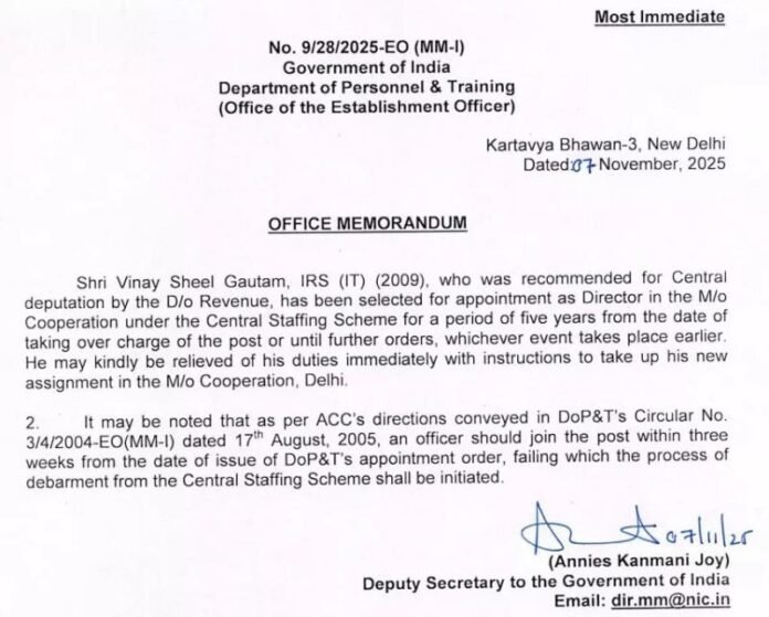 आदेश के अनुसार, 2009 बैच के IRS अधिकारी विनय शील गौतम को राजस्व विभाग की अनुशंसा पर सहकारिता मंत्रालय, नई दिल्ली में निदेशक नियुक्त किया गया है। उन्हें केंद्रीय स्टाफिंग योजना (Central Staffing Scheme) के तहत पांच साल या अगले आदेश तक इस पद पर कार्यरत रहने का प्रावधान है। आदेश में कहा गया है कि वे तत्काल अपना कार्यभार ग्रहण करें।