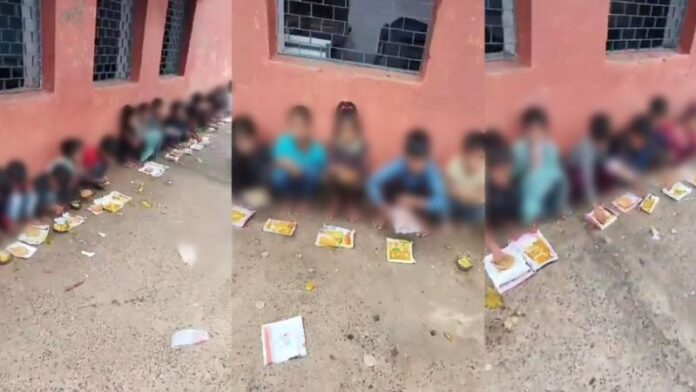 श्योपुर/मध्य प्रदेश: मध्य प्रदेश के श्योपुर जिले से एक हैरान करने वाला मामला सामने आया है। हुल्लपुर स्थित सरकारी माध्यमिक विद्यालय में विद्यार्थियों को मिड-डे मील जमीन पर परोसा गया। बच्चे स्कूल की बिल्डिंग के बाहर दीवार के सहारे बैठकर पेपर पर रोटी और सब्जी खा रहे थे।