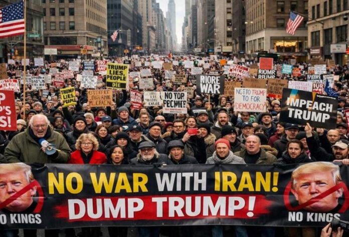 वाशिंगटन। ईरान में तख्तापलट और बगावत का ख्वाब देख रहे अमेरिकी राष्ट्रपति डोनाल्ड ट्रंप को अपने ही देश में विरोध का सामना करना पड़ा रहा है। ‘नो किंग्स’ आंदोलन के तहत अमेरिका के 3,200 स्थानों पर 90 लाख लोग सड़कों पर उतर आए। तानाशाही रवैये और युद्ध नीतियों के खिलाफ भड़का यह आक्रोश अब ट्रंप की कुर्सी के लिए खतरा बन गया है। अमेरिका में ट्रंप की नीतियों के खिलाफ जन-आक्रोश की एक नई लहर देखने को मिली है। शनिवार को अमेरिका के सभी 50 राज्यों समेत दुनिया के कई प्रमुख शहरों में नो किंग्स विरोध प्रदर्शन हुए। आयोजकों का दावा है कि यह अमेरिकी इतिहास के सबसे बड़े विरोध प्रदर्शनों में से एक है।