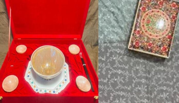 शिगेरु इशिबा को दिया यह विंटेज कटोरा सेट भारतीय शिल्पकला और जापानी पाक कला परंपरा का एक अनूठा संगम प्रस्तुत करता है. इसमें एक बड़ा भूरे रंग का मूनस्टोन कटोरा शामिल है, जिसे चार छोटे कटोरों और चांदी की चॉपस्टिक्स के साथ सजाया गया है. इस डिजाइन की प्रेरणा जापान के पारंपरिक डोनबुरी और सोबा रीति-रिवाजों से ली गई है. मुख्य कटोरे में प्रयुक्त मूनस्टोन आंध्र प्रदेश से प्राप्त की गई है जो अपनी चमक के साथ प्रेम, संतुलन और सुरक्षा का प्रतीक मानी जाती है. इस कटोरे का आधार राजस्थान के प्रसिद्ध मकराना संगमरमर से बना है जिस पर पारंपरिक पर्चिन कारी शैली में अर्ध-कीमती पत्थर जड़े हुए हैं.