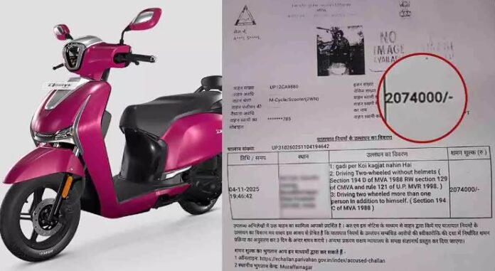 मुजफ्फरनगर: उत्तर प्रदेश के मुजफ्फरनगर जिले से एक चौंकाने वाली घटना सामने आई है। 4 नवंबर को नई मंडी थाना क्षेत्र के गांधी कॉलोनी चौकी पर स्कूटर चालक अनमोल सिंघल को हेलमेट न पहनने और वाहन दस्तावेज़ न होने के आरोप में ₹20.74 लाख का चालान जारी किया गया। चालान में यह भी लिखा गया कि पुलिस ने स्कूटर ज़ब्त कर लिया है।