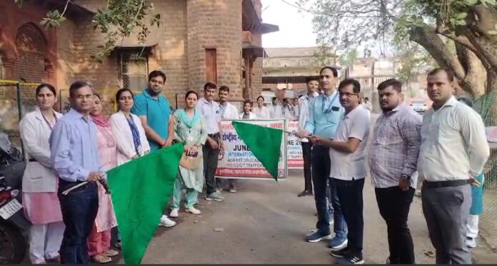 अलवर. राष्ट्रीय मानसिक स्वास्थ्य कार्यक्रम के अंतर्गत बुधवार को अंतरराष्ट्रीय नशा निरोधक दिवस पर राजीव गांधी सामान्य अस्पताल परिसर से जागरूकता रैली निकाली गई। इस जागरूकता रैली को सीएमएचओ योगेंद्र शर्मा, प्रमुख चिकित्सा अधिकारी डॉक्टर सुनील चौहान, डिप्टी सीएमएचओ महेश बैरवा ने हरी झंडी दिखाकर जिला अस्पताल से रवाना किया। रैली जिला अस्पताल से रवाना होकर नंगली सर्किल होते हुए वापस जिला अस्पताल पहुंची। जागरूकता रैली में सीएमएचओ योगेंद्र शर्मा, डिप्टी सीएमएचओ महेश बैरवा, जिला अस्पताल के प्रमुख चिकित्सा अधिकारी डॉक्टर सुनील चौहान सहित नर्सिंग छात्र छात्राएं मौजूद थे। इस मौके पर सीएमएचओ योगेंद्र शर्मा ने कहा मादक पदार्थ सहित नशे को लेकर आमजन और समाज को जागरूक करने के लिए यह चेतना रैली निकाली गई। आमजन तथा युवाओं को विभिन्न कार्यक्रमों के माध्यम से नशे से होने वाले दुष्प्रभावों से जागरूक किया जायेगा समाज में जागरूकता आने से नशे पर रोक संभव है। जिससे की आमजन सहित समाज में यह संदेश जाए कि नशे से दूर रहे। उन्होंने कहा किसी भी तरह का नशा व्यक्ति के जीवन पर बुरा प्रभाव डालता है और उसके दुष्परिणाम भी सामने आते हैं। ऐसे में अगर कोई भी व्यक्ति नशा करता है तो उसको सामाजिक परिवेश में लाकर नशे से दूर रहने के लिए जागरूक किया जा सकता है। इसके अलावा नशा व्यक्ति के जीवन सहित आर्थिक सामाजिक पारिवारिक रूप घातक है। उन्होंने कहा कि तंबाकू आज मानव जीवन के लिए घातक बन गई है। तंबाकू से कैंसर जैसी बीमारियां होती है।