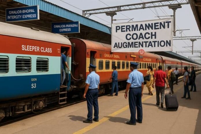 भोपाल। यात्रियों की सुविधा एवं बढ़ती मांग को देखते हुए, रेल प्रशासन द्वारा गाड़ी संख्या 12198/12197 ग्वालियर–भोपाल इंटरसिटी एक्सप्रेस तथा 11801/11802 ग्वालियर–प्रयागराज एक्सप्रेस की कोच संरचना में एक अतिरिक्त स्लीपर श्रेणी कोच को स्थायी रूप से जोड़ने का निर्णय लिया गया है।