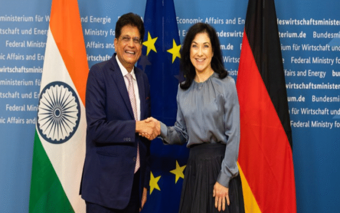 व्यापार: बर्लिन में केंद्रीय वाणिज्य और उद्योग मंत्री पीयूष गोयल ने गुरुवार (23 अक्तूबर) को जर्मनी की आर्थिक मामलों और ऊर्जा मंत्री कैथरीना रीचे के साथ मुलाकात की। इस दौरान दोनों नेताओं के बीच ग्रीन एनर्जी, न्यू और इमर्जिंग टेक्नोलॉजी और डिफेंस पर भारत और जर्मनी के बीच सहयोग बढ़ाने पर चर्चा की गई। इसी के साथ उन्होंने भारत की विशाल प्रतिभा क्षमता और व्यापार सुगमता में किए गए सुधारों पर प्रकाश डालते हुए जर्मन कंपनियों को भारत में निवेश विविधीकरण के लिए आमंत्रित किया।