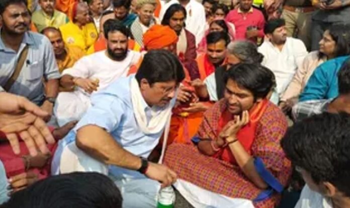 बागेश्वर धाम के पीठाधीश्वर धीरेंद्र कृष्ण शास्त्री की सनातन एकता पदयात्रा मथुरा पहुंच चुकी है। शुक्रवार को पदयात्रा के दौरान जनसत्‍ता दल लोकतांत्रिक के अध्‍यक्ष रघुराज प्रताप सिंह राजा भैया धीरेंद्र शास्त्री का हाथ पकड़कर चलते दिखे। दोनों ने हाथ उठाकर जयकारे भी लगाए। सड़क पर बैठकर पत्‍तल में पूड़ी-सब्‍जी खाई। इस बार की यात्रा में उनके दोनों पुत्र कुंवर शिवराज प्रताप सिंह और कुंवर बृजराज प्रताप सिंह भी साथ रहे। यात्रा स्थल पर एमएलसी कुंवर अक्षय प्रताप सिंह सहित बड़ी संख्या में समर्थक मौजूद रहे