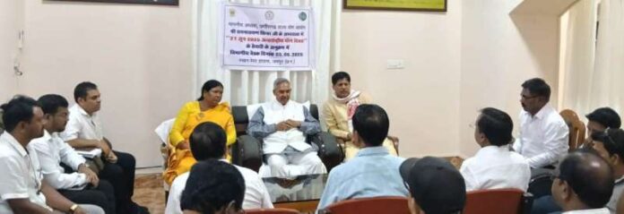 रायपुर : आगामी 21 जून को अंतर्राष्ट्रीय योग दिवस के अवसर पर राज्य स्तरीय वृहद सामूहिक योगाभ्यास का आयोजन जिला जशपुर में प्रस्तावित है। इस भव्य आयोजन की तैयारी को लेकर जशपुर जिला मुख्यालय में स्थित रेस्ट हाउस में एक महत्वपूर्ण बैठक आयोजित की गई। बैठक में छत्तीसगढ़ राज्य योग आयोग के अध्यक्ष रूपनारायण सिन्हा ने कार्यक्रम की रूपरेखा और दिशा पर मार्गदर्शन प्रदान किया।