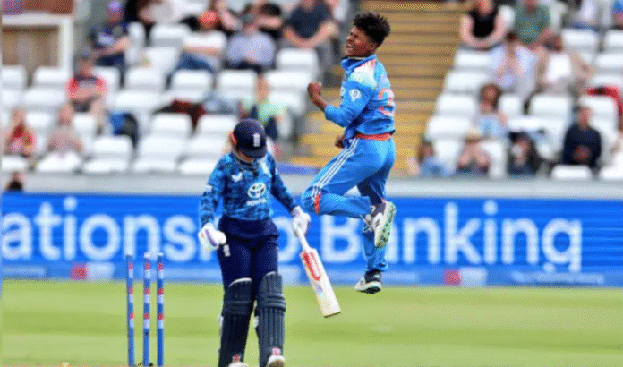 टीम इंडिया की 22 साल की तेज गेंदबाज क्रांति गौड ने पाकिस्तान के खिलाफ इस मैच में अपनी गेंदबाजी से कहर बरपाया. मगर उनके योगदान की शुरुआत टीम इंडिया की बल्लेबाजी के दौरान हो गई थी, जब 49वें ओवर में आकर इस युवा खिलाड़ी ने एक चौका लगाया और फिर 50वें ओवर में दोबारा गेंद को बाउंड्री तक पहुंचाया. मगर अपना असली कमाल तो क्रांति ने गेंदबाजी में दिखाना था और इसमें ज्यादा वक्त नहीं लगाया.