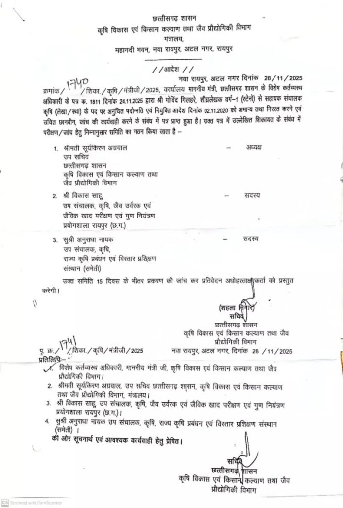 गोविंद गिलहरे पदोन्नति घोटाला एक बार फिर चर्चा में है। कृषि विभाग में हुई इस अनियमित पदोन्नति ने सरकार को सख्त कार्रवाई करने के लिए मजबूर किया है। भूपेश बघेल शासनकाल में एक स्टेनो को नियम विरुद्ध तरीके से सहायक संचालक कृषि (लेखा/स्था.) के पद पर पदोन्नत किया गया था। अब कृषि मंत्री रामविचार नेताम ने इस नियुक्ति को निरस्त करते हुए पूरा मामला फिर से जांच के दायरे में ला दिया है।