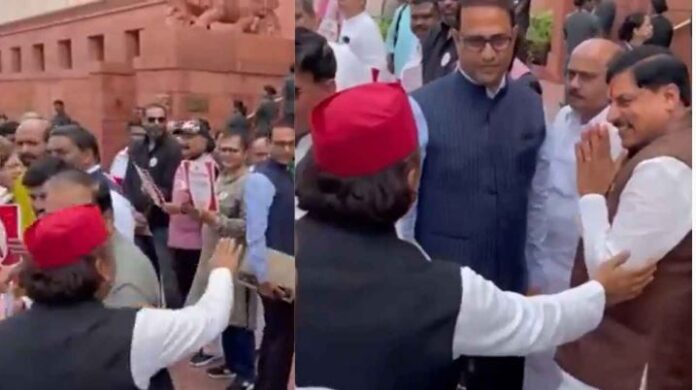 विपक्षी दलों के सांसद जब प्रदर्शन कर रहे थे उस दौरान मध्य प्रदेश के CM डॉ. मोहन यादव भी संसद पहुंचे। वह PM नरेंद्र मोदी से मिलने के लिए संसद के अंदर जा रहे थे। इस दौरान जब सपा प्रमुख अखिलेश यादव ने प्रदर्शन के दौरान CM डॉ. मोहन यादव को जाते हुए देखा तो उन्हें पीछे से आवाज लगाई। सपा प्रमुख अखिलेश यादव की पुकार सुनकर CM मोहन यादव रुके और पीछे मुड़कर उन्हें नमस्कार किया। दोनों ने हाथ मिलाया और बातचीत भी की। इसके बाद CM मोहन यादव अंदर जाने के लिए आगे बढ़ गए और अखिलेश यादव वापस प्रदर्शन में शामिल हो गए। इस मुलाकात का वीडियो भी सामने आया है।