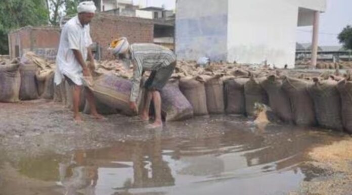 भीगा हुआ 'सोना': व्यापारियों द्वारा ढेर लगाकर रखा गया हजारों क्विंटल गेहूं और केंद्रों पर तुलाई का इंतजार कर रही किसानों की उपज पूरी तरह जलमग्न हो गई।